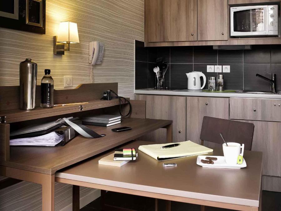 La cocina ofrece el equipamiento necesario para un uso diario: placas vitrocerámicas, microondas, refrigerador, lavavajillas, campana extractora, vajilla e incluso un kit de limpieza. Así, puede optar por cenar tranquilamente en su apartamento después de un día de visitas o elegir una comida en el restaurante Fogg del establecimiento, que propone un menú inspirado en sabores internacionales, por las noches de lunes a sábado.