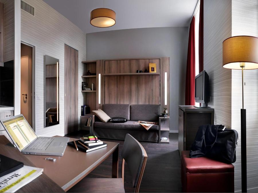 La decoración, sobria y contemporánea, prioriza la claridad y la eficiencia. Los materiales son discretos, los tonos equilibrados y los espacios están bien distribuidos. Todo está diseñado para que pueda acomodarse y sentirse rápidamente a gusto, sin recargar ni ser austero. Algunos apartamentos disponen de un rincón de salón confortable con sofá cama, práctico si viaja con varias personas.