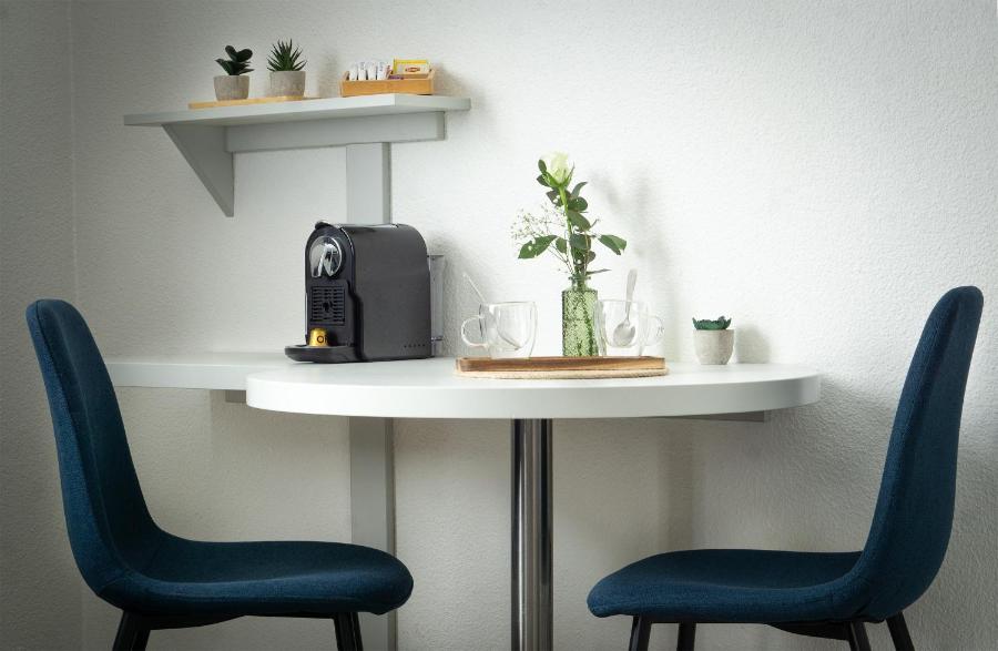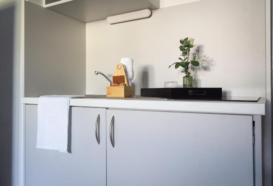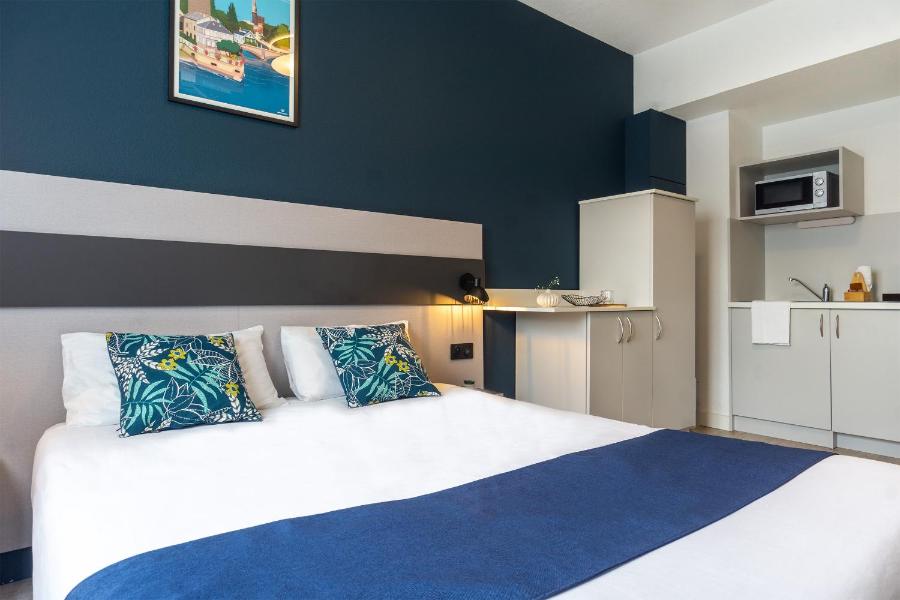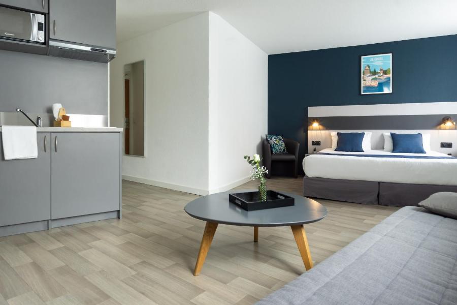 El establecimiento reúne 156 alojamientos distribuidos en estudios y suites, diseñados para acoger tanto estancias cortas como visitas prolongadas. Todos los apartamentos están equipados con una cocina americana, con nevera, microondas, vajilla y utensilios de cocina, permitiendo disfrutar de la estancia a su propio ritmo, sin restricciones. Un rincón comedor complementa este equipamiento, aportando una verdadera flexibilidad de uso, ya sea que viaje solo, en pareja o por motivos laborales.